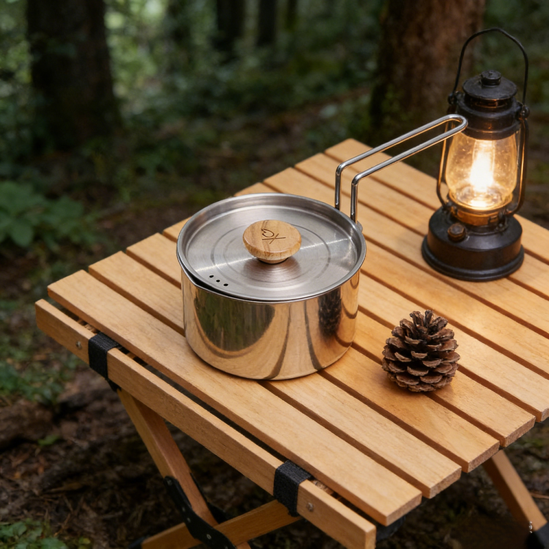 携帯用ステンレスキャンプケトル、蓋と折りたたみハンドル付き、アウトドアクッキング用